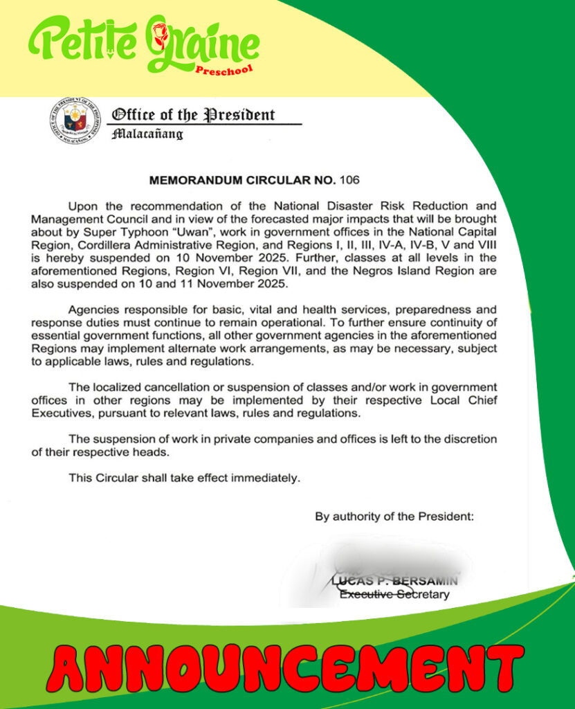As per Memorandum Circular No. 106 released by the Office of the President, there will be no classes on November 10 (Monday) and 11 (Tuesday), 2025 due to the forecasted impact of Super Typhoon Uwan.